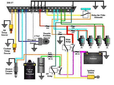System The whole system is laid out in this picture showing the whole of the fuel and wiring layout. The 37 pin D-Sub plug is the main connection to the fuel system and sensors on the car. |