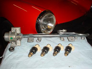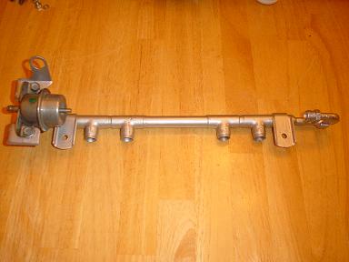 Injectors The business end of the system. A fuel pressure regulator is mounted on the end of the rail which is originally from a Volvo 240 Turbo. The injectors are from a Rover 216 which should provide the right amount of petrol for around 100-110bhp, my eventual target out of the little 1500. |
