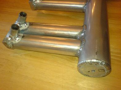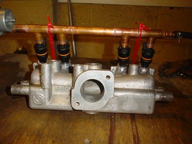 prepared The manifold after it had been machined to take the injectors. Gaping great 'oles in the alluminium were a bit offputting but necessary to fit the pockets to be welded in. |