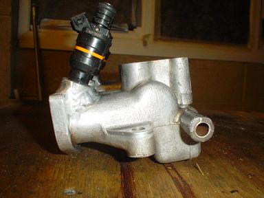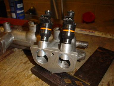 2 Using some old injectors for testing, this shows the general arrangement of an injector placed in the machined holes. It is almost 45° to the gasket face and as sharp an angle as possible without fouling the connections needed, of course, it is still yet to be welded up so the fun has not really started. |