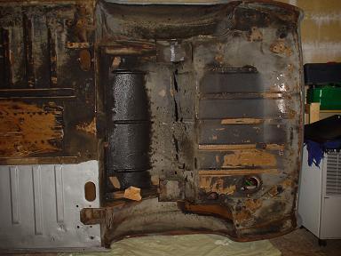 Floor Pan As you can see from this picture, I have started cleaning the shell up. The driver's floor pan has been stripped back and treated with acid etch epoxy. A lot more work to do but at least it all looks sound. I really wish some pillock hadn't put a jack under the floor! |